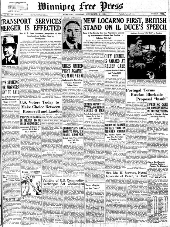On Nov. 3, 1926: The Manitoba Free Press reported Britain said a new European pact akin to the Locarno agreements had priority over any negotiations concerning the Mediterranean, in repsonse to a speech made by Italian premier Benito Mussolini. In Ottawa, authority regarding travel by land, sea and air was amalgmated in the new federal ministry of transport. U.S. voters would go to the polls to determine whether to return Democrat Franklin D. Roosevelt to the White House or to elect Republican challenger Alfred Mossman Landon as president. Read the rest of this day’s paper here. Search our archives for more here.