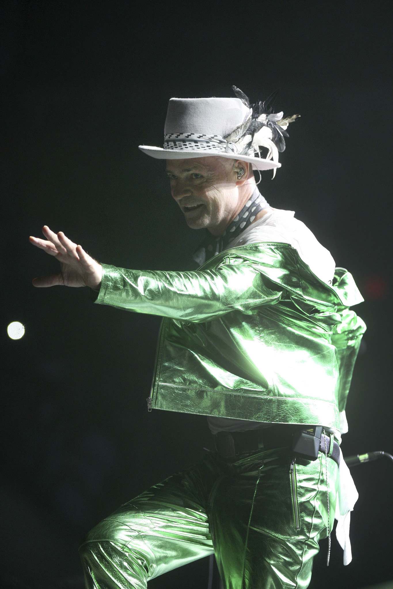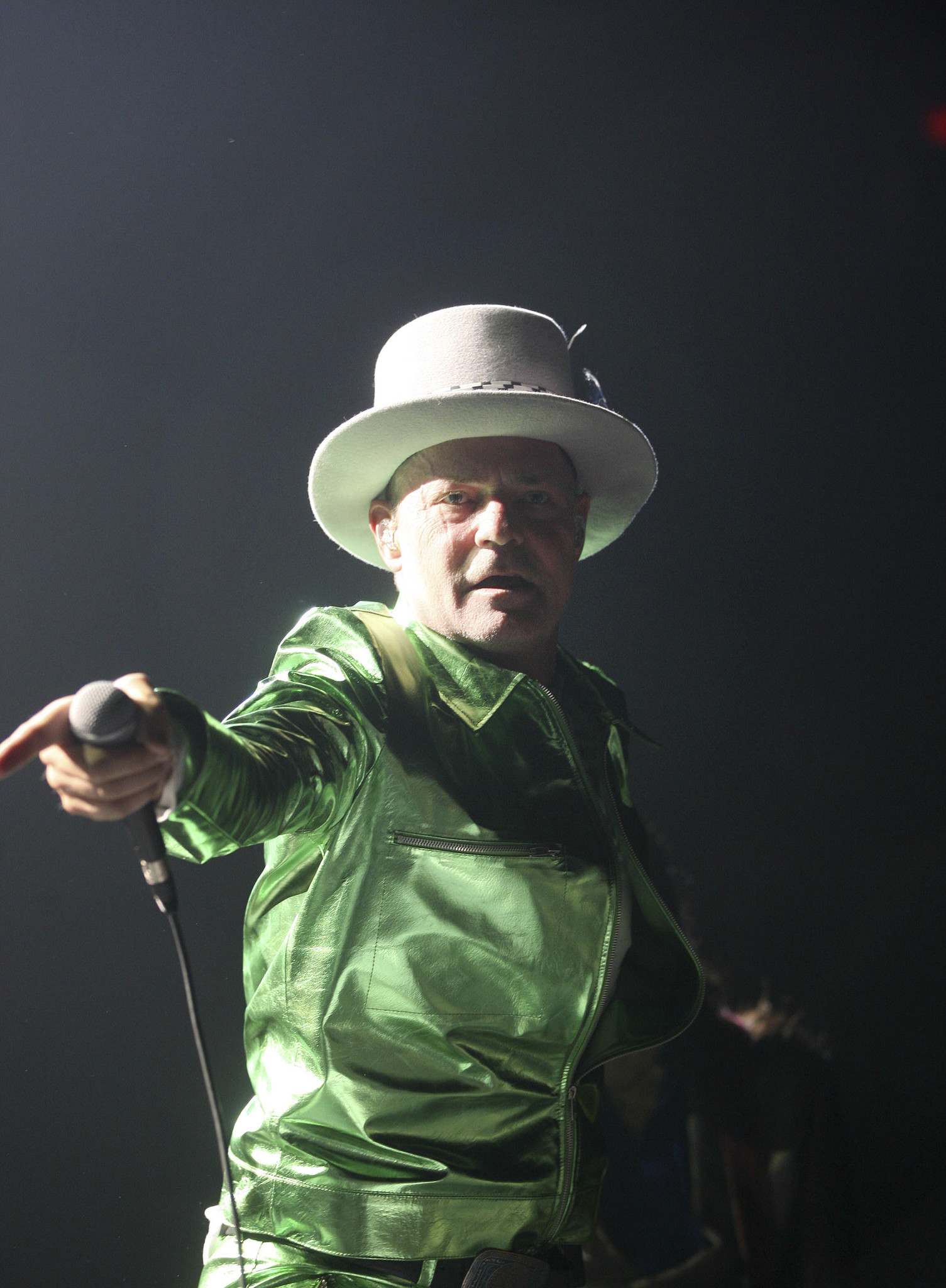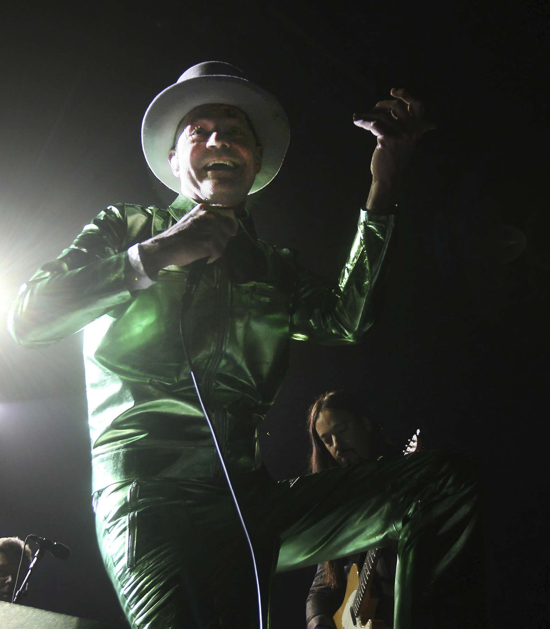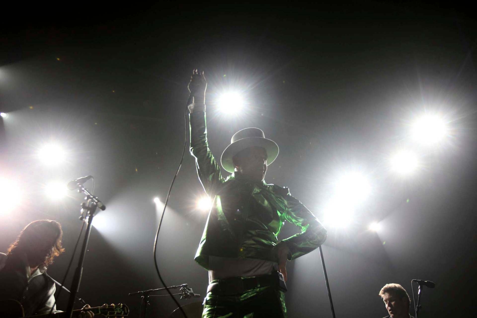 At 8:30 p.m. on the nose, Gord Sinclair, Rob Baker, Paul Langlois, Johnny Fay and Downie were greeted by a standing ovation. Downie, dressed in a metallic lime-green suit, wasted no time throwing out some of his signature dance moves, his erratic limbs popping and locking as he and his bandmates kicked off the show with At the Hundreth Meridian.