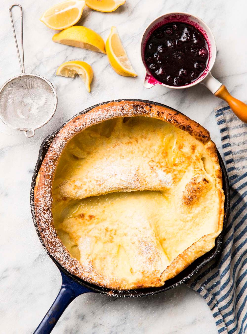 When the Dutch Baby is done, remove from the oven and use an offset spatula to lift it onto a cutting board. Cut into wedges. Sift confectioners’ sugar over each piece and serve with lemon wedges and blueberry sauce.