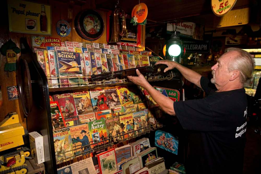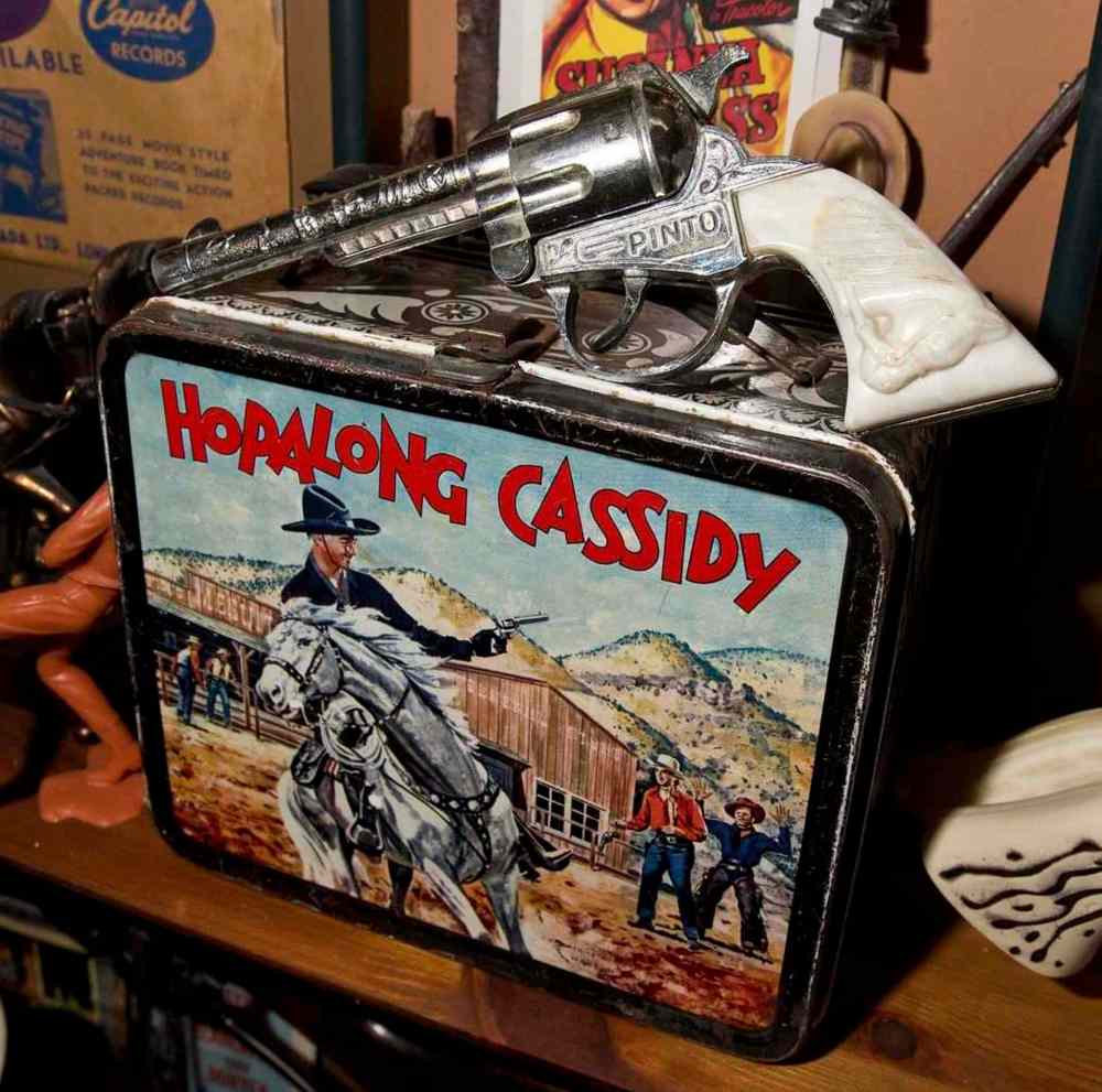 “To me, this is art,” he says, plucking the strings of a toy guitar bearing the images of Roy Rogers and his trusty steed, Trigger. “I’d rather have sheriff badges or plastic figures or cap guns on the wall than a painting, that’s for sure.”