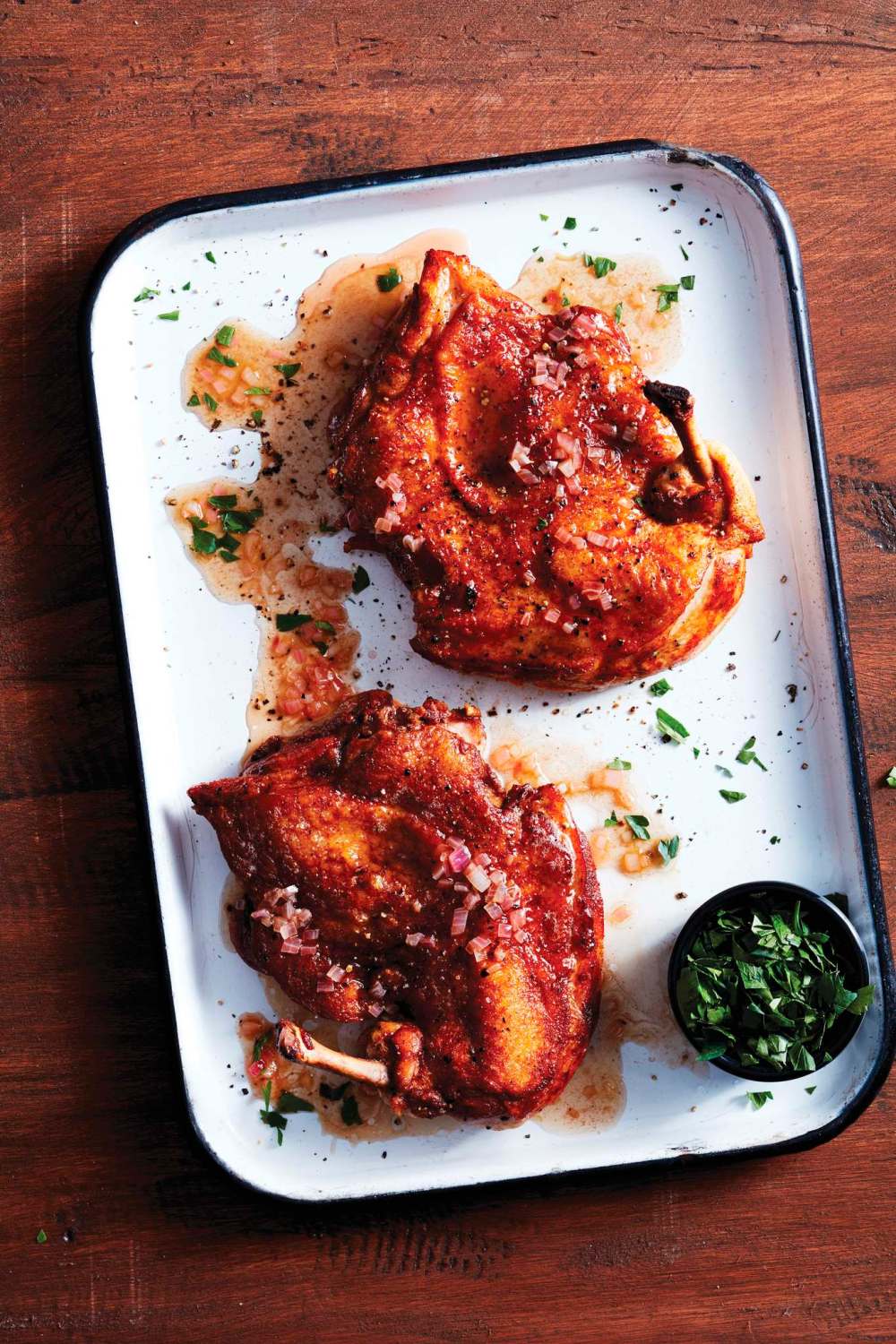 Using a wooden spoon and the juices in the pan, do your best to loosen all the brown bits stuck to the bottom of the pan, stirring it around to blend the flavours. Then hold a fine-mesh sieve over the chicken (which is on a plate or platter, remember?) and pour the contents of the pan through the sieve and over the entire chicken.