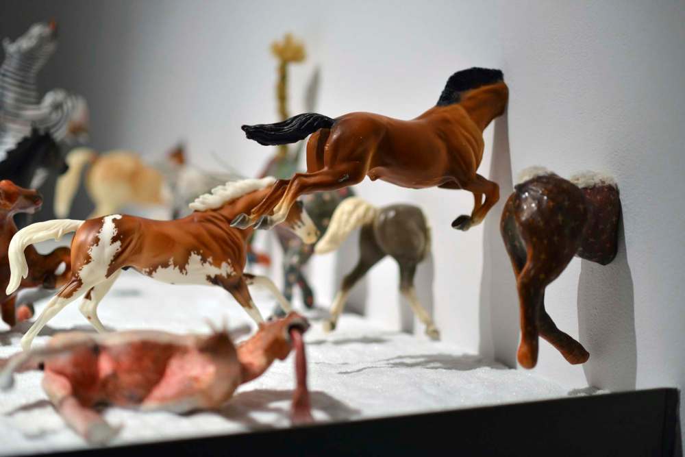 For those who haven’t seen the installation, Herd is comprised of 150 plastic toy horses charging up a 40-foot ramp. Upon closer inspection, about half of the four-legged creatures have been mutated. Some have long and winding tongues, some appear to have been maimed — and repaired — beyond recognition.