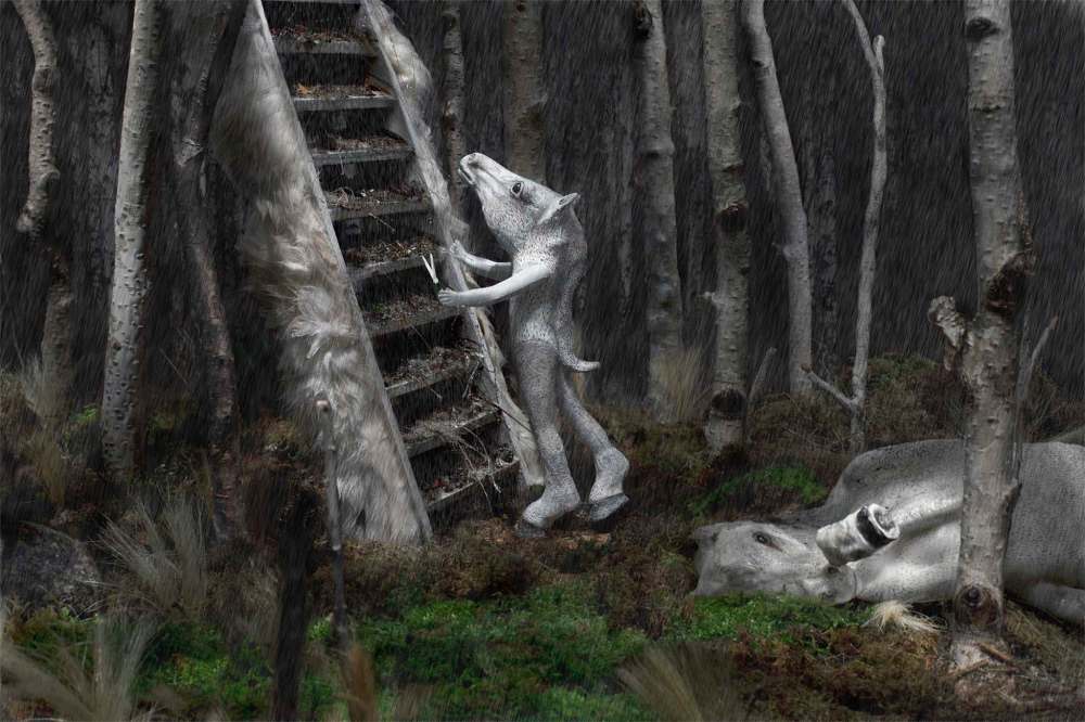 Q: The forest as a dangerous place for innocents and how fairy tales reinforced those perceptions are a couple of themes you explore in this project. Instead of using unaltered figurines and toy/miniature animals, you re-imagine these themes with deformed and mutilated toy horses and ponies and mutant humanoids you’ve described as the horses’ caretakers.