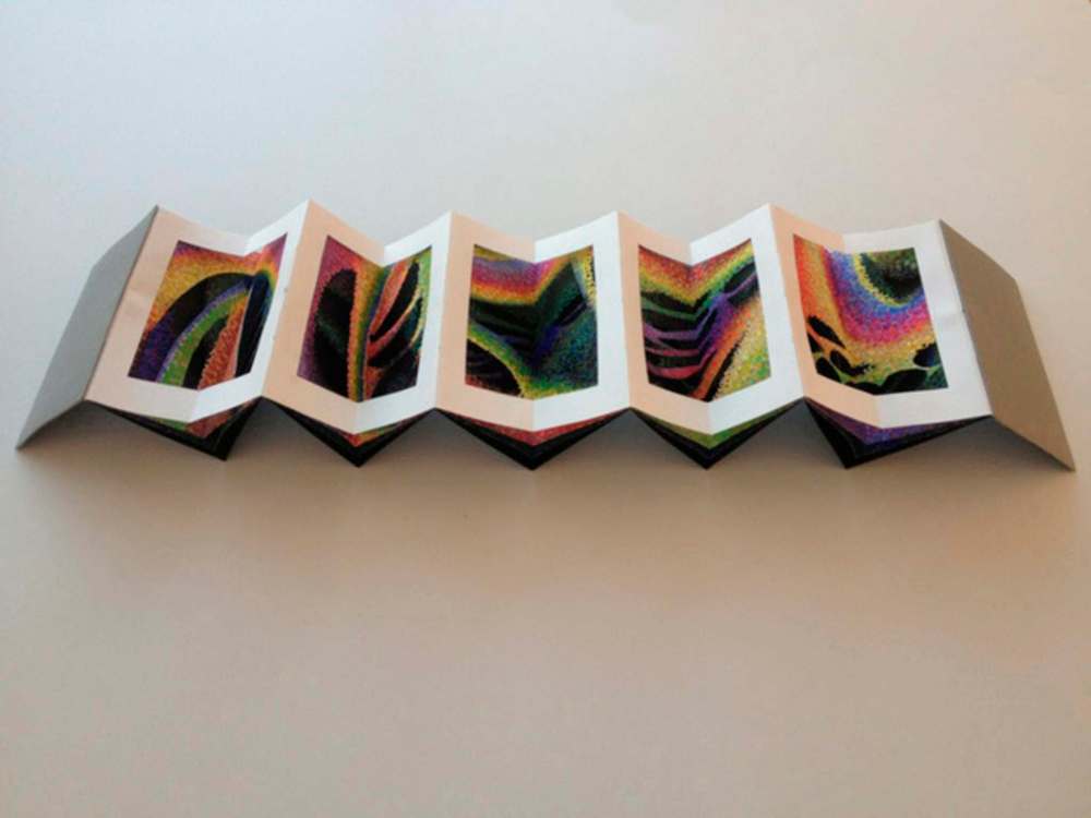 There are different forms of binding, as well as books that use elaborate folded pages and tricky pop-ups. Some bookworks are teeny-tiny, but some go way beyond conventional book size: Huebner once constructed a book so big, people could sit inside.