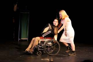 Before long, it was the other way around. At the age of 14, the budding playwright premièred a Winnipeg fringe show, Sucker in 2008, which Debbie directed. That was after Debbie took a summer off from family to tour her own fringe show. She returned and vowed the following year she would perform at the fringe as a family, a promise she kept in 2007 with the show Candy From a Baby, followed in 2009 with Molotov Circus, which cast Debbie as a wheelchair-bound performer, billed as the world’s “sexiest chicken geek.” Gislina played her daughter, rebelling at chores such as pulling mom around with a rope. Gislina’s brother, Solmund MacPherson, also joined the cast as an “anti-gravity boy.”