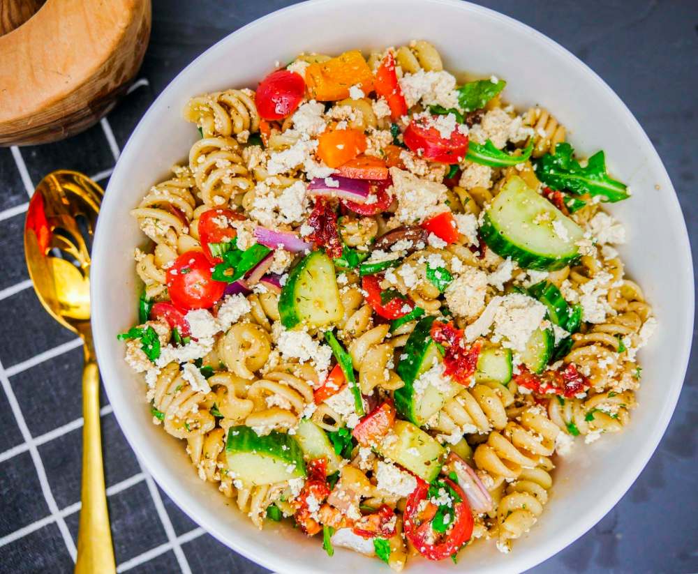 Transfer the pasta to a big mixing bowl. Add all of the veggie ingredients on top and mix in. Don’t add tofu feta yet.