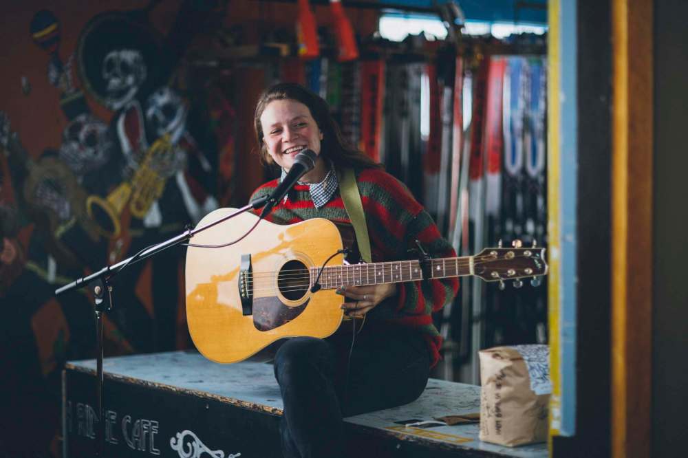 “There’s not a huge year-round population that lives here, so we ended up convincing a lot of our musician friends to come and work at the ski hill when they’re not out touring,” says Emily Christie, general manager of the rental shop. “In 2012… we just had no snow, but a lot of staff sitting around and playing music. We decided, ‘Hey, if we can’t ski, let’s get people out for some music.’”