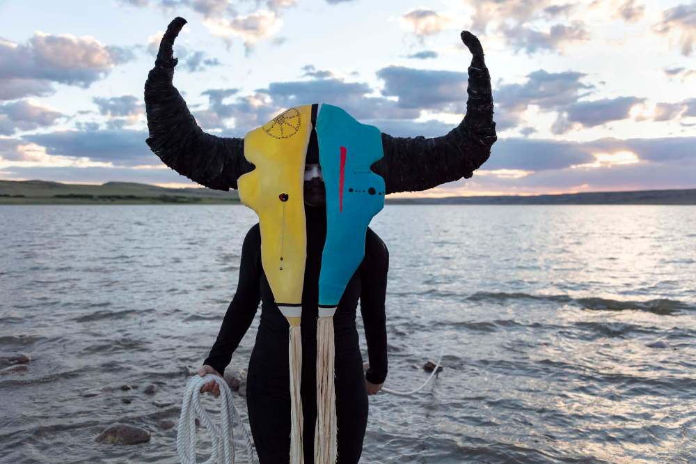 One of the exhibition’s key photographs is titled Calling Me Home, and it is part a retelling of a Cree legend and part autobiographical study. McMaster, who also is of English and Dutch heritage, says she wears a yellow-and-blue bison skull that she created and poses on the shore of a lake, carrying a rope that trails into the water.