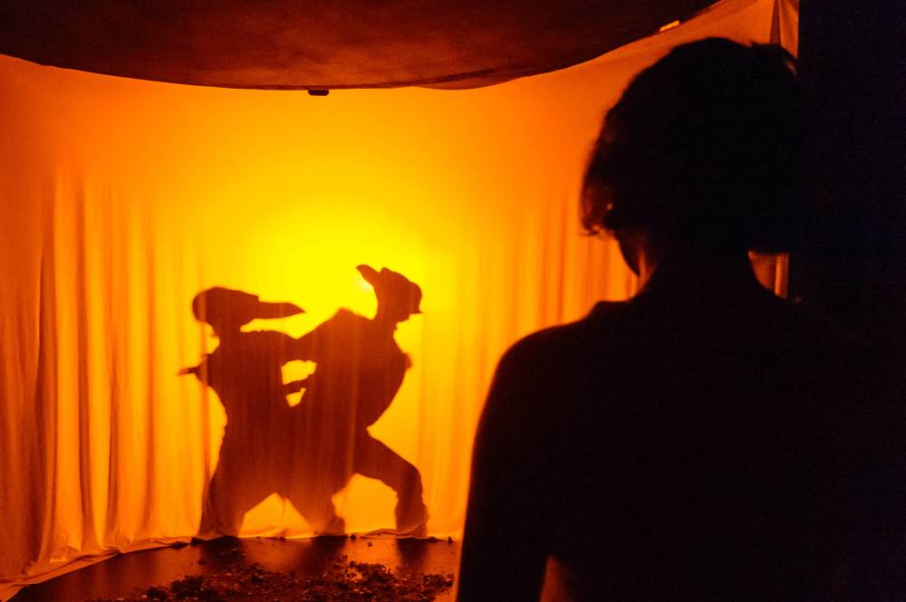 Director Jacqueline Loewen’s rendition of the tale is set in the hollow of a tree trunk, and the scent of wood shavings on the ground make it feel like entering an animal’s lair. Eric Blais and Victoria Emilie Hill are Janus, crowned with crow-like beaks. The veil between god and human is a literal screen on which shadows dance and puppets play (Scott Henderson’s lighting is key here).