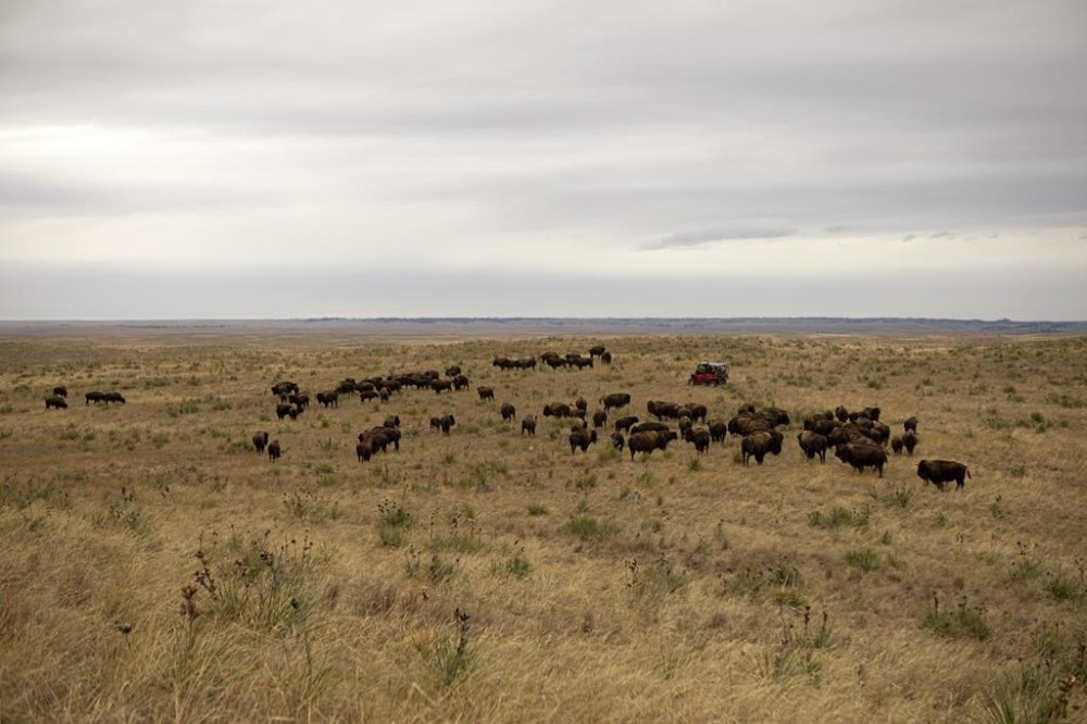 The day after the bison transfer from the Badlands, Heinert’s son T.J. had his rifle fixed on a large bull bison at the Wolakota Buffalo Range. The tribal enterprise in just two years has restored about 1,000 bison to 28,000 acres (11,300 hectares) of rolling, scrub-covered hills near the Nebraska-South Dakota border.