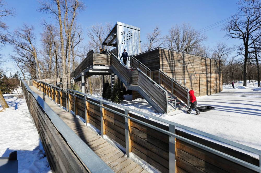 The multi-level Manitoboggan at St. Vital Park features an accessible ramp and metal grates on walkways to reduce snow accumulation.