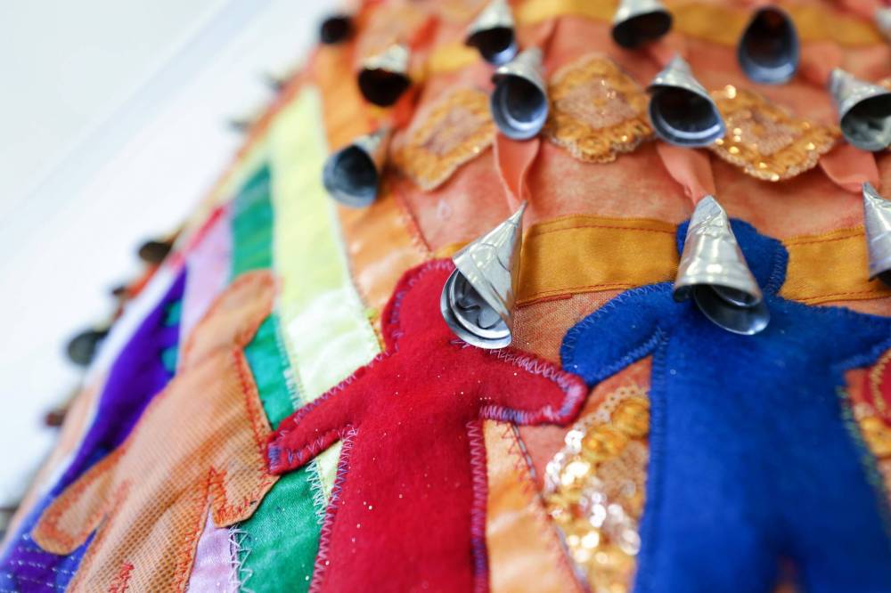 A closeup look at Awasisuk, a jingle dress made by Amanda Grieves, on display at the Canadian Museum for Human Rights.