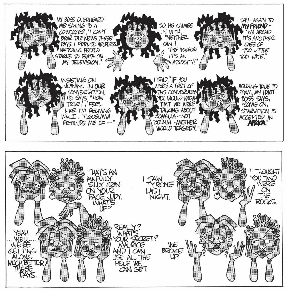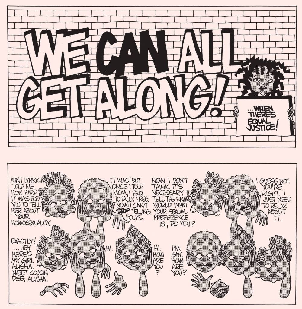 The artist packs a lot of personality into this group of friends by way of diverse hairstyles (there’s a great strip about the effect of humidity levels on natural Black hair) and wonderfully expressive faces. Her nine characters speak directly to each other in different combinations, drawn within a straightforward, usually borderless layout of four to six panels per strip.