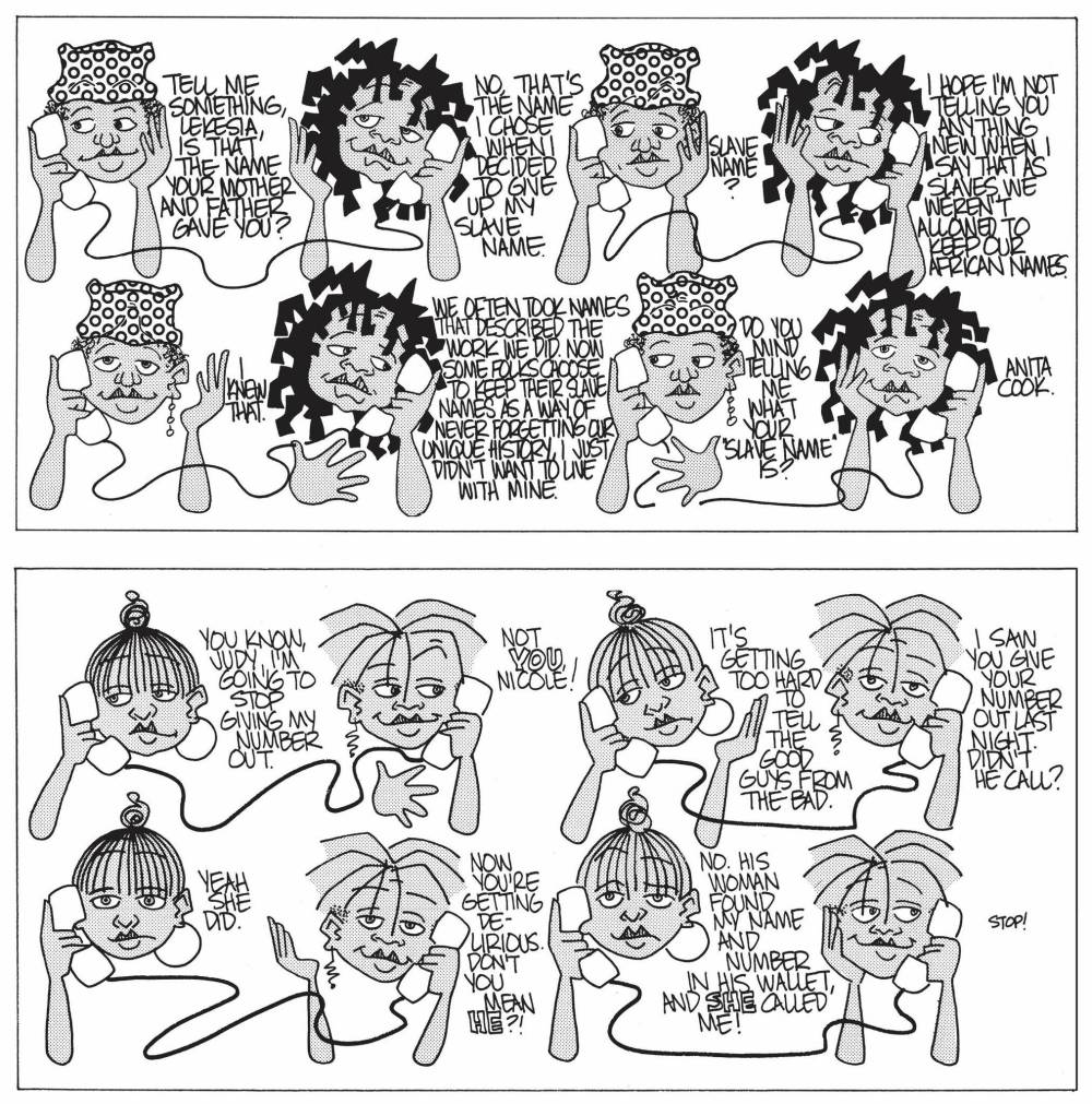 In another strip, glamorous Nicole dials each of her friends in sequence, hoping one of them will endorse her idea to reconnect with a dubious ex. In fact most, if not all, of Brandon-Croft’s characters give sound advice they themselves would refuse to take. This extremely relatable facet of many friend groups is used to great comedic effect; in current times, one could easily imagine these women on a wildly popular podcast, packed with wisecracking social commentary and hilarious stories about bad bosses and even worse dates, all of which are plentiful in this collection.