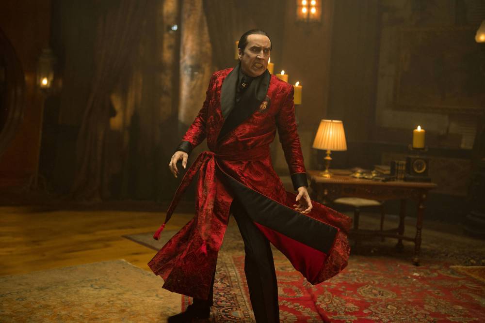 Nicolas Cage camps it up like crazy, portraying Dracula as a whiny, aggrieved narcissist with a flair for showmanship. (Michele K. Short / Universal Pictures)
