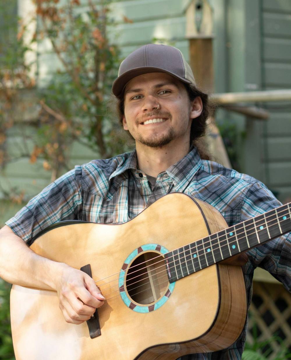 He uses the final product, a large acoustic with turquoise accents that is loud enough to not be drowned out by a fiddle player.