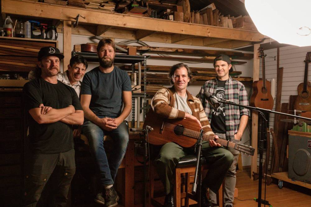 SUPPLIED From left: Trevor Bennett (King Tide Films), Paul Moquin (photographer), Lee Hyldig (luthier), Grant Davidson, a.k.a. Slow Leaves and Chris Neal (sound engineer) in Hyldig’s workshop in North Saanich, B.C.