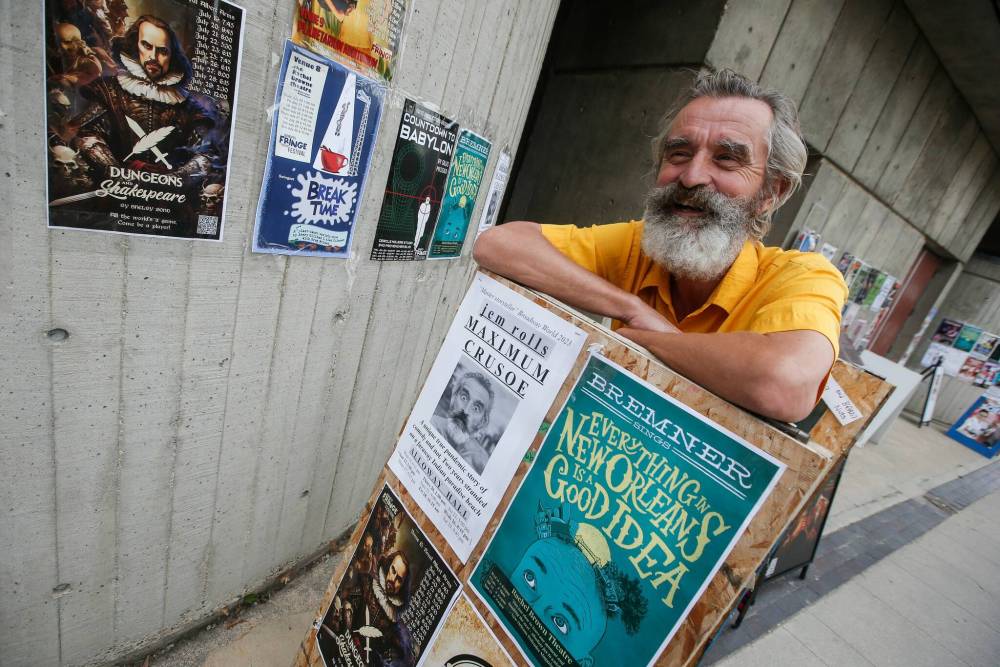 Winnipeg wasn’t part of his odyssey until Monday, when he was back to his fringe routine of slapping posters on walls and sandwich boards in front of RMTC, meeting with old friends and the folks who have put him up for two weeks.