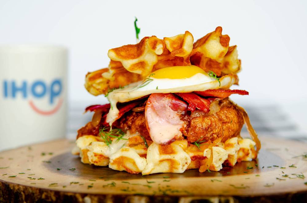 SUPPLIED IHOP Winnipeg aims to ‘fill your pothole within’ with waffles, hot peach honey breaded chicken breast, caramelized onions, bacon, a sunny side up egg and maple honey dill aioli.