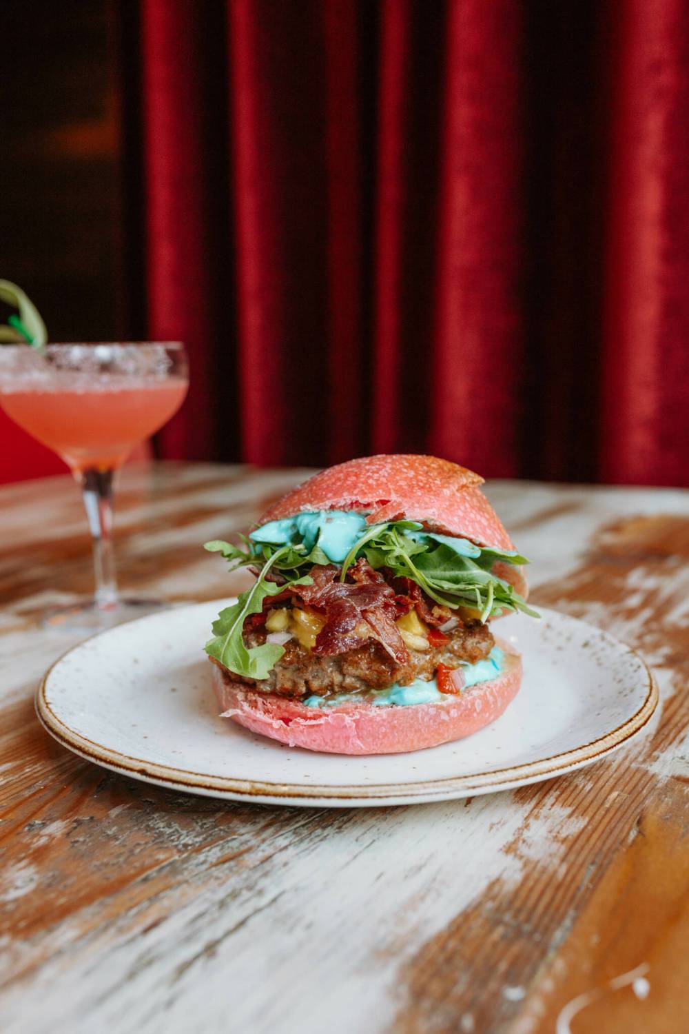SUPPLIED The Malibu Barbie’s Dream Burger from The Merchant Kitchen features a pink bun, veal and pork patty, Cajun spice, pineapple Malibu rum relish, serrano ham crisp, arugula and Ken Sauce (roasted garlic sage aioli).