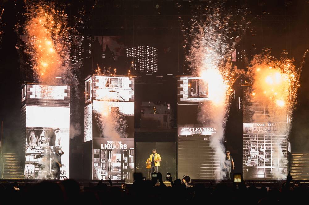 While set dressing for his previous appearance was sparse, Wednesday’s show was anything but. Four large towers transformed throughout the night, from projection screens to city blocks to raised platforms hosting a live band. Fireballs raged, backup dancers twerked in unison, lasers flashed, multiple bras were tossed on stage and a giant piece of glittering 50 Cent bling descended from the ceiling.