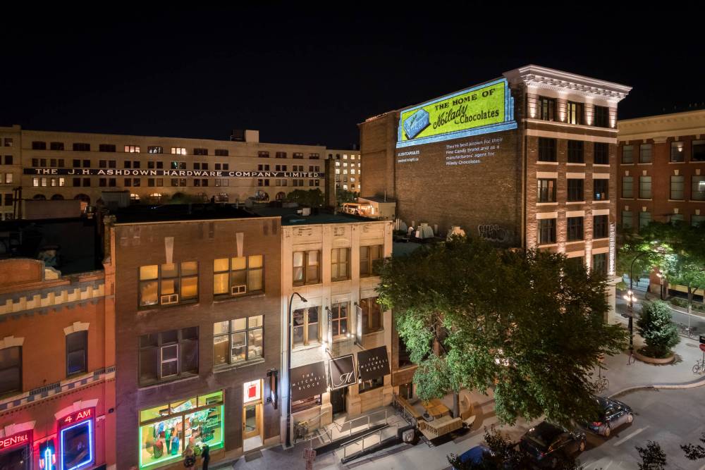 When Winnipeg urban archeologist Matt Cohen and Craig Winslow, an artist and designer with the Portland, Ore., firm Light Capsules, flick the switch at 8:30 p.m., two faded pieces of advertising that adorn one of the exterior walls of the building will glow in the dark.