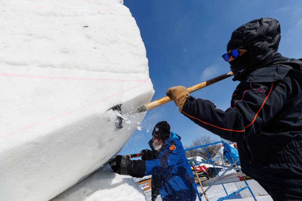 MIKE DEAL / FREE PRESS From left, Bob Fulks, from Detroit, and Franziska Agrawal from Munich, Germany, team up to work on an snow sculpture they have titled, Twist.