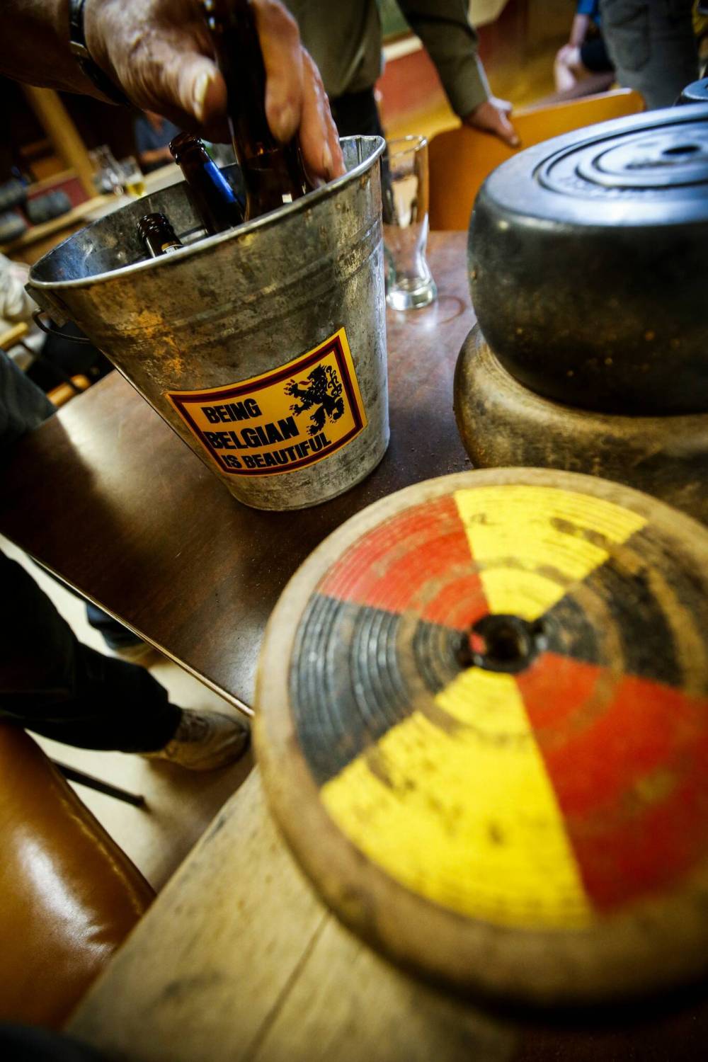 Because the Belgian Club’s pair of basement alleys are purposely concave, I’d been coached to start the bolle well left of the target area, the goal being to have it curve back and come to a rest, as close to the stake as possible. Problem was, my initial throw was overly aggressive, which caused the bolle to careen into John’s ankle, much to the amusement of my fellow participants. (Did I mention bolles, which are ordered from a manufacturer in the U.S., weigh between five and eight pounds each?)