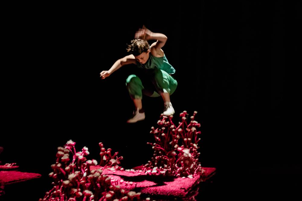 French visual artist Julia Morlot’s luscious “hyper pink” playground provides plenty of eye candy; a space-defining rug is flanked by an otherworldly garden filled with flowers (mushrooms?) created by twisted, tufted ropes. The production rounds out with effective lighting by Quebec designer Andréanne Deschênes, with Pascale Guené’s (mostly) earth-toned costumes keeping the focus squarely on pink.