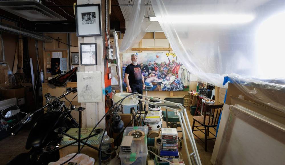 Boss is seeking a gallery to exhibit his large painting. In the meantime it sits in his crowded Exchange District studio amid his other works and another muse, his 1979 Harley-Davidson motorcycle.