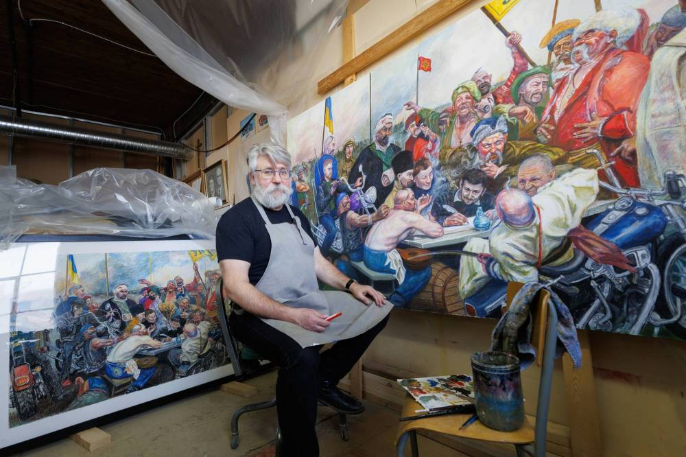 In the week leading up to the second anniversary of Russia’s invasion, Boss put the final touches on Ukrainian Kozaks Send a Letter to Putin, a 1.2-by-2.4-metre oil painting that adds contemporary resistance fighters and rebels that fit alongside Repin’s cossacks from 1676, which Boss replicated with his own brush.