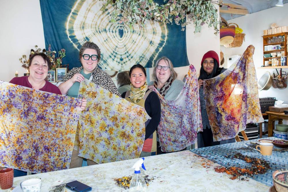 Photos by BROOK JONES / FREE PRESS Still (centre) is flanked by participants Karie Mooney (from left), Hillary Dux, her mother Colleen Dux and Free Press writer AV Kitching as they show off the silk bandanas they dyed with dried flower blooms.