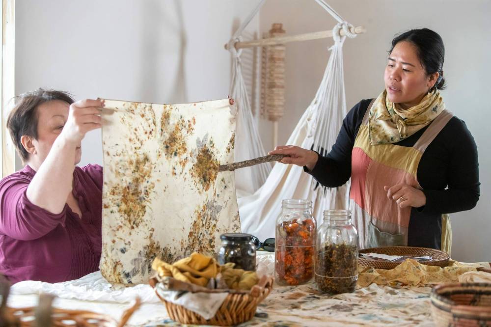 BROOK JONES / FREE PRESS Lourdes Still explains the process of dyeing fabric with dried flower blooms.