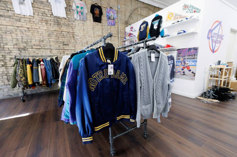 Like the previous site, selections at the Clothing Bakery are sorted first by style, then by colour. New features include a lounging area if you’re waiting on somebody who’s trying things on plus an entire wing devoted to what Delera refers to as “hometown heroes.” There you’ll find Jets gear, Blue Bombers paraphernalia, Goldeyes pennants… even a Winnipeg Thunder warm-up jacket.