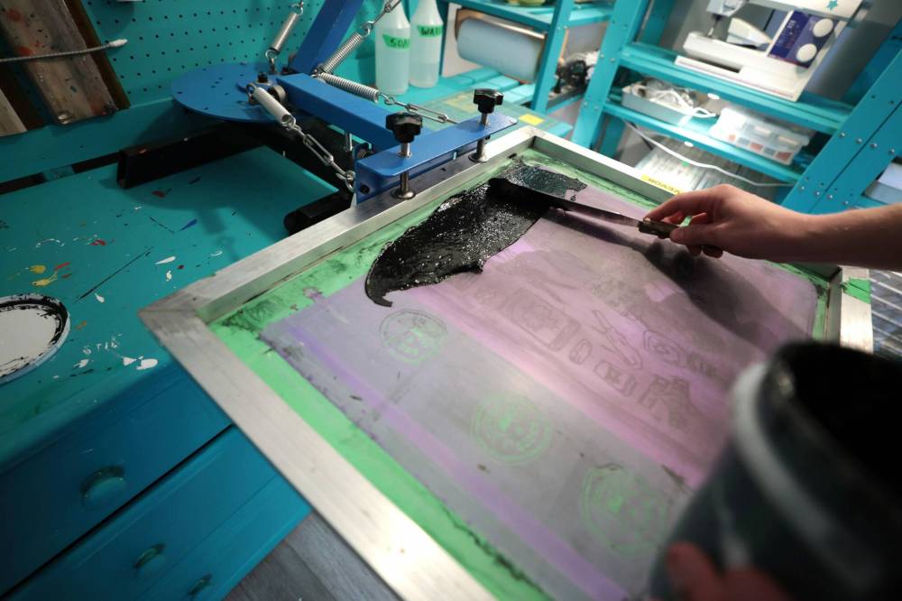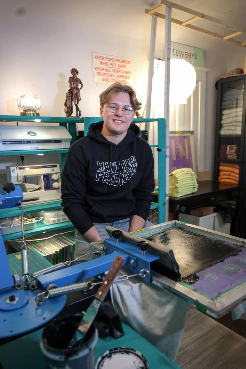 Cole Wielgosz, the founder of Honey Dill Print Shop, goes through the process of screenprinting a shirt in his workshop.(Ruth Bonneville / Free Press)