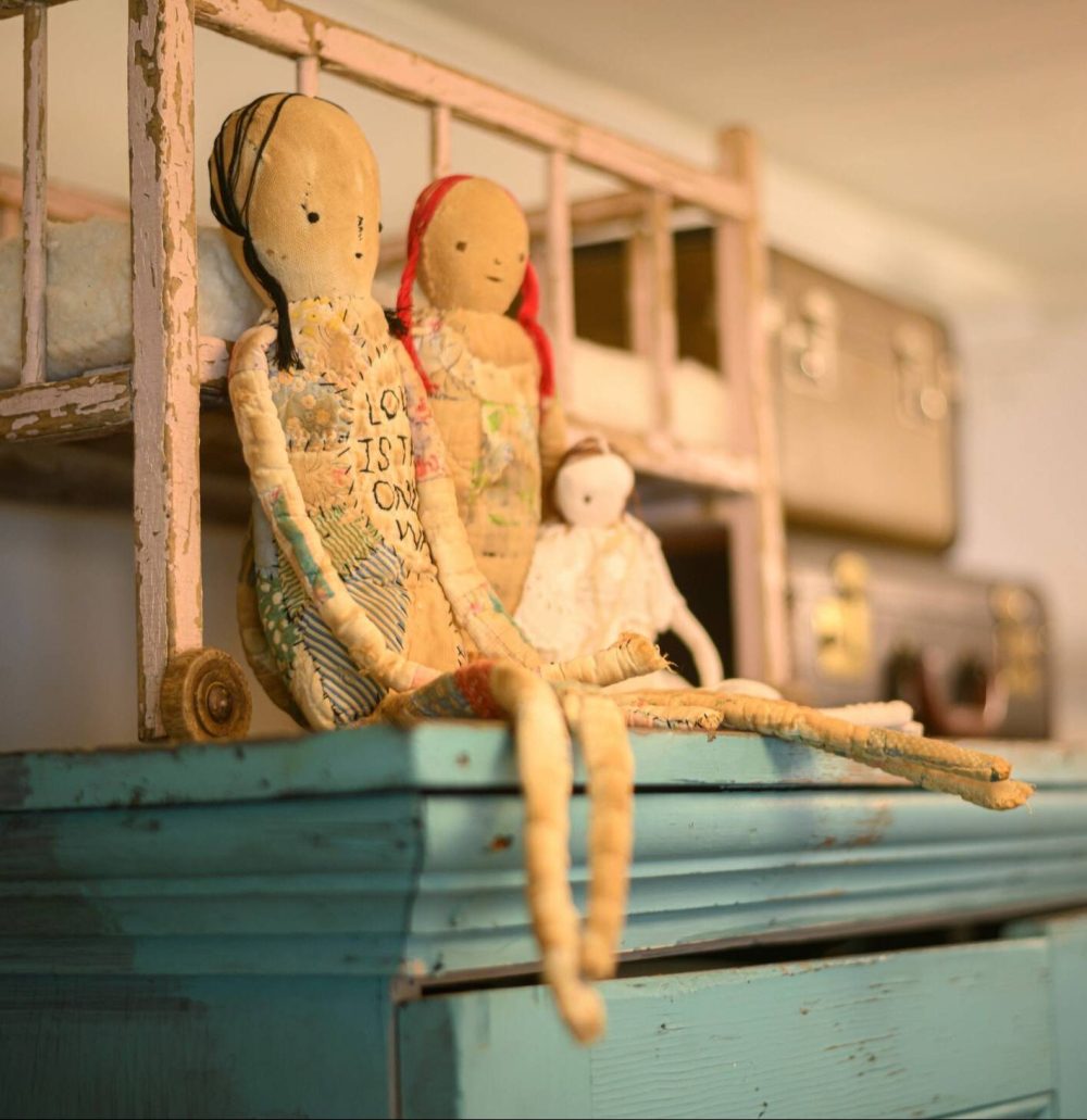 Dolls are dressed in clothing made from cotton and linen scraps Wesley sources from her own wardrobe of handmade items, and shoes are painted on and distressed to evoke a vintage feel.