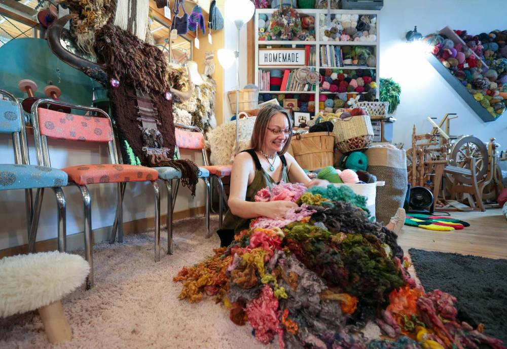 She’s collected more than 200 kinds of raw wool, which she now keeps at her studio, Wool Mountain in ARTLington Studios on Arlington Street, after running out of room in her house.