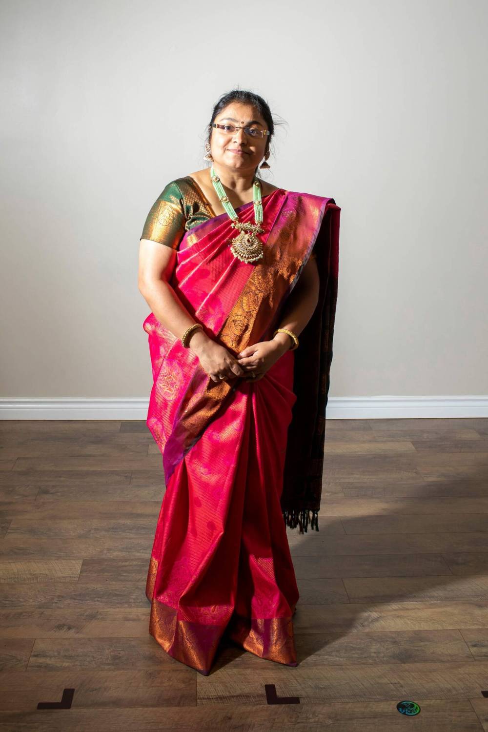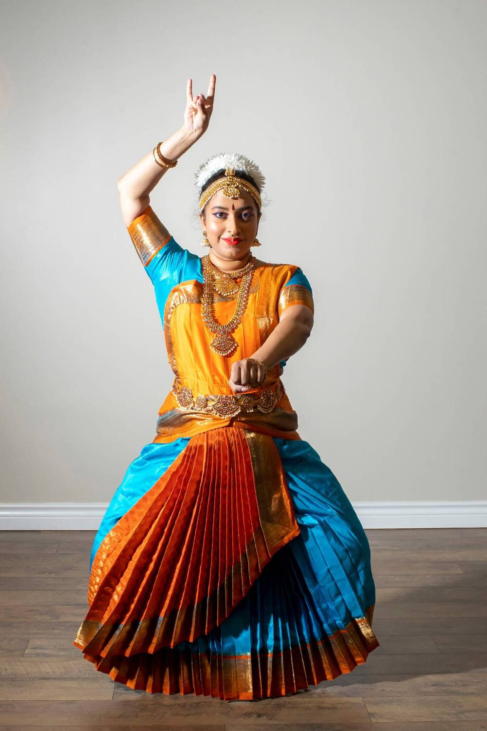 Mayura Manivasan demonstrates a general dance pose while wearing a practice saree costume. Bharatanatyam dancers emote through movement, conveying shringara (love), hasya (laughter), karuna (compassion), veera (courage), bhayanaka (fear), bhibatya (disgust), raudra (anger), shantha (peace) and adbuta (amazement).