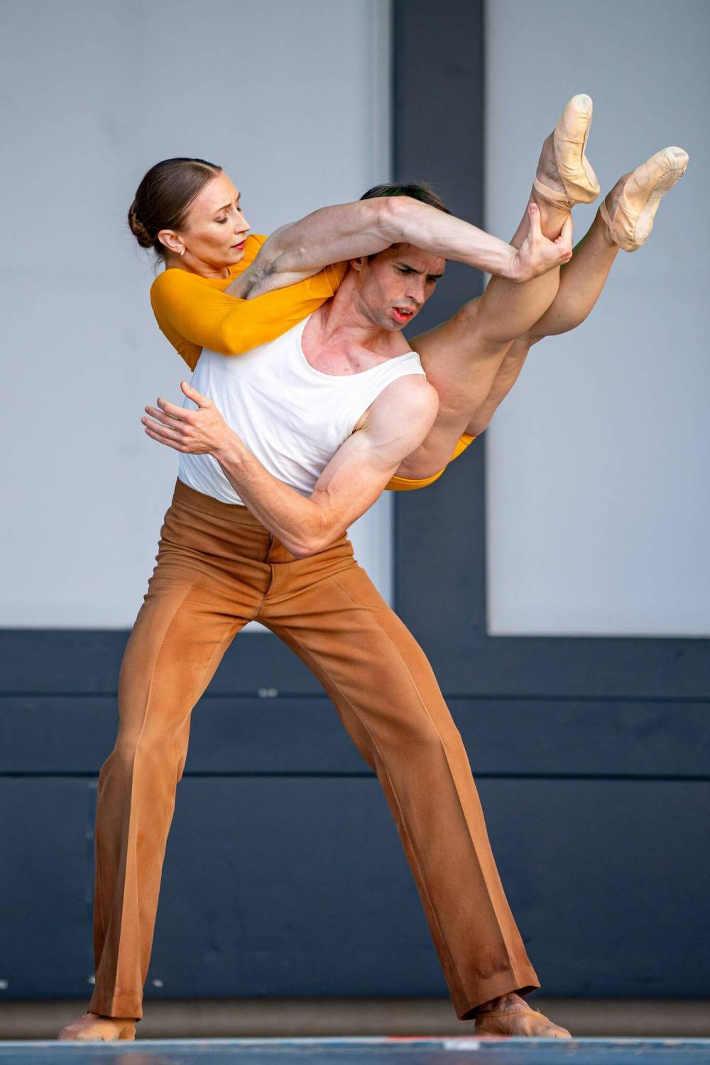 The dancers take turns stretching their limbs out towards each other throughout the 11-minute, classically based duet, with McAdie also showing off her rock-steady pointe work, not to mention nerves of steel, as Lancksweerdt lifts her sky-high before twisting her around his body like a cobra.