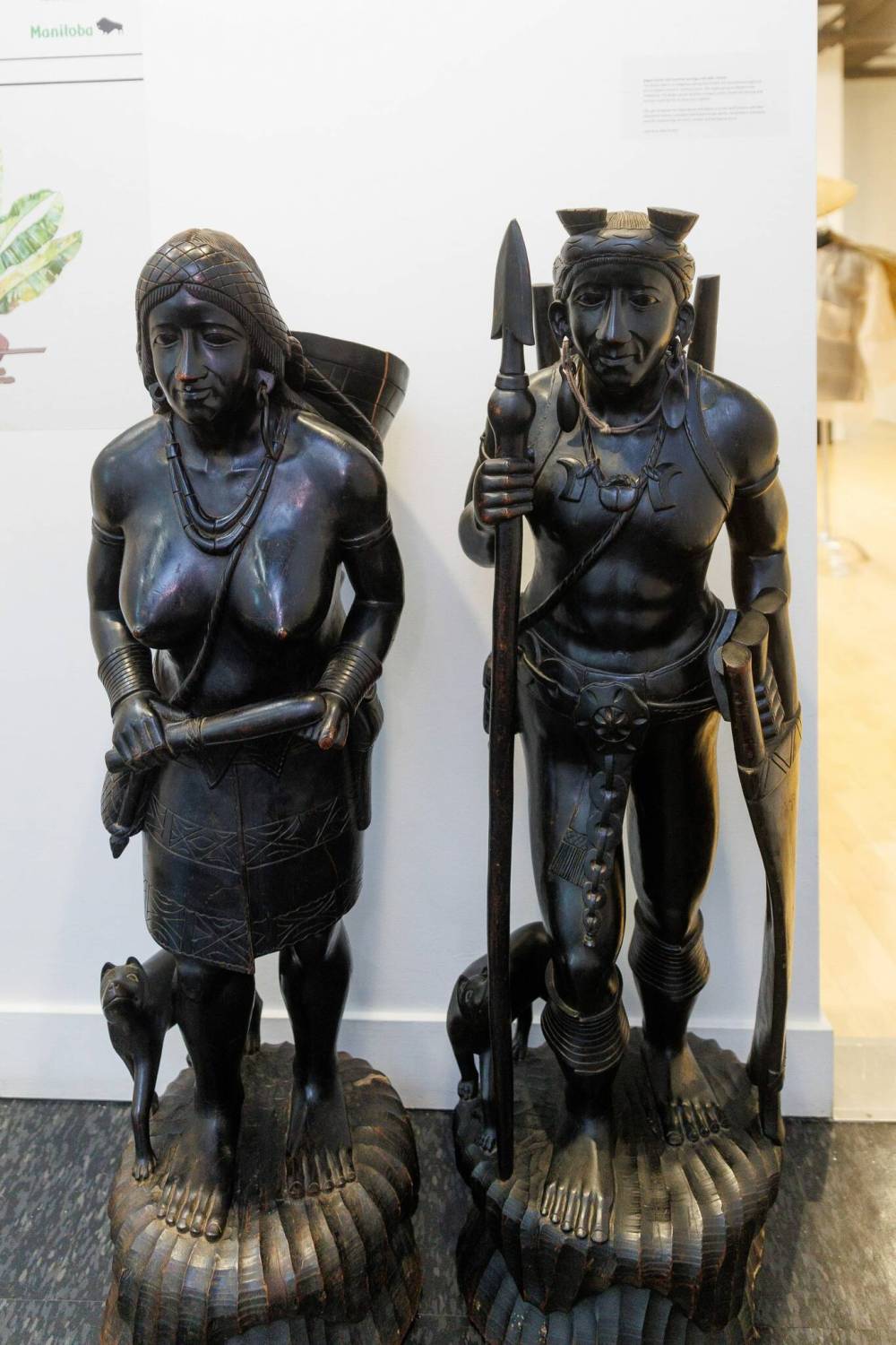 As visitors enter, they are greeted by a pair of Ifugao hunter and huntress carvings from the mid-20th century, made from hardwood native to the Philippines and depicting an indigenous group from the Cordillera region of northern Luzon.