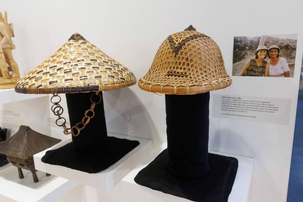 Moving through the exhibition, visitors encounter a wide range of traditional Filipino crafts. The basketry section features pieces like the Salakot, a traditional headgear made from bamboo, palm and rattan leaves, worn by the Tagalog and Kapampangan peoples. These items, loaned by community members Allan Pineda and Ruby Maestro Manalang, feature vivid hues and natural materials.