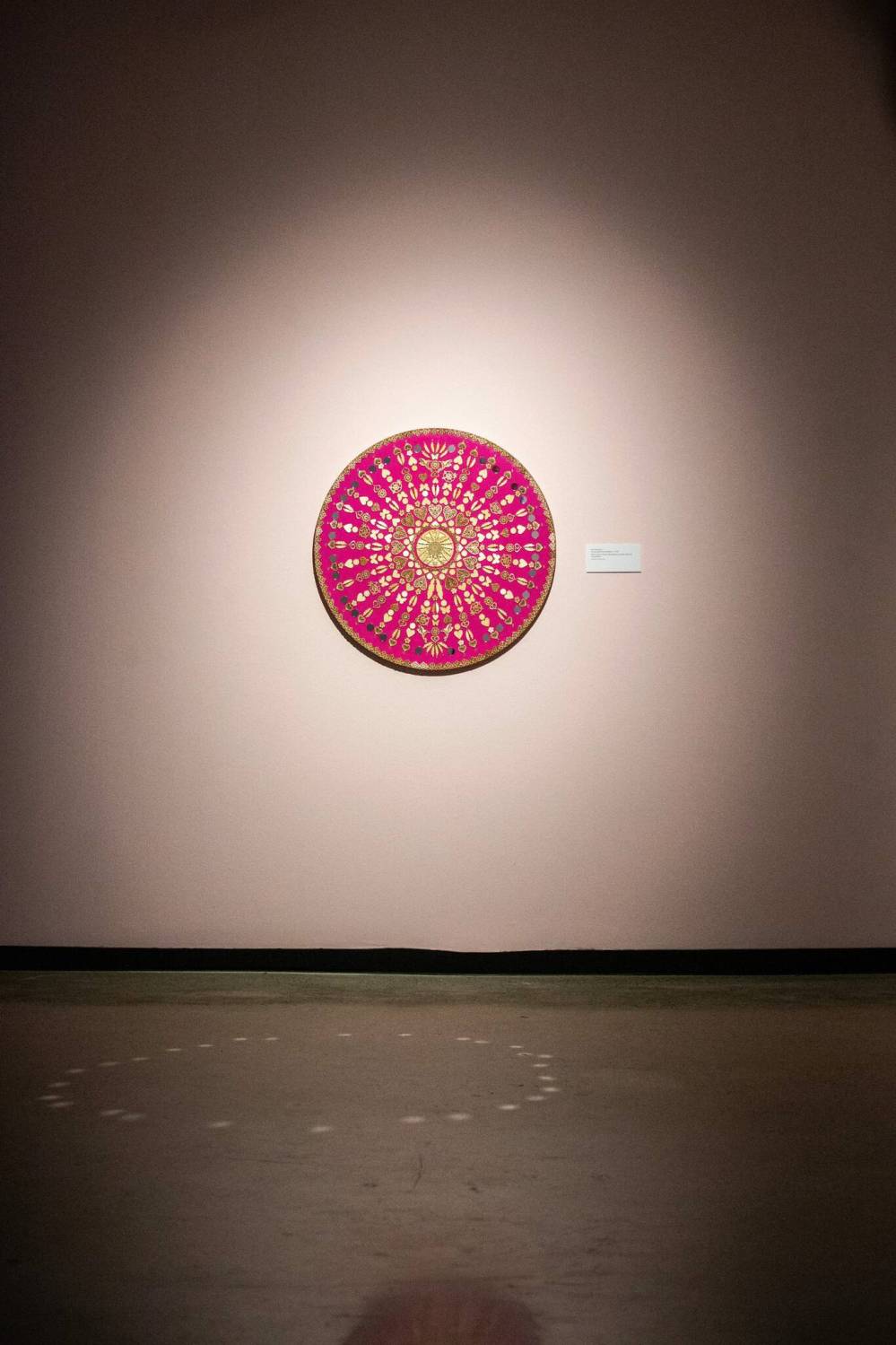 Warm Heart Wheel, a smaller work that hangs on the wall nearby, also references the heart, both in its title and in its repeating motifs. In this piece, gold hearts — some solid shapes, others having a delicate filigree — alternate with leaves, flowers, butterflies and birds. Creating patterns of energy against a vivid pink background, these images suggest the connection between the human heart and the natural world.