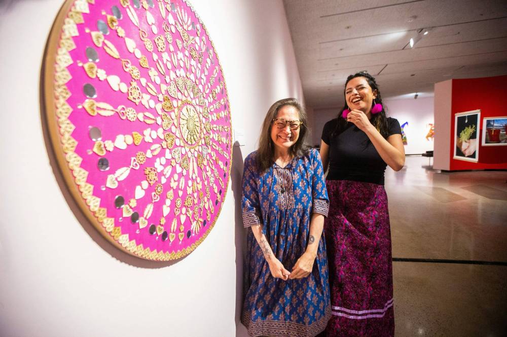 MIKAELA MACKENZIE / FREE PRESS FILES Artist Lita Fontaine (left) and assistant curator Marie-Anne Redhead with Warm Heart Wheel: My Medicine Series.