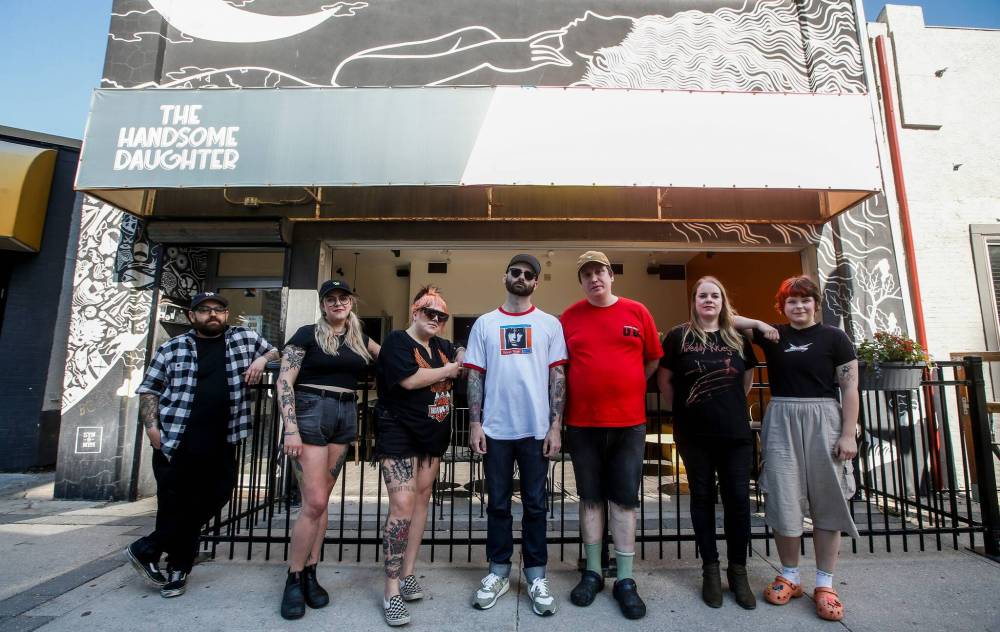 Handsome Daughter staff, from left: owner Jay Evaristo, bartender Karlee Liljegren, marketing co-ordinator Jessa Johnson, co-GMs Jessee Kowalski and Mike O’Connell, bartender Chelsa Schioler, and café consultant Ryan Boyes.