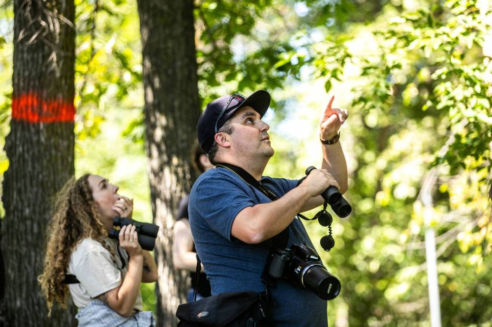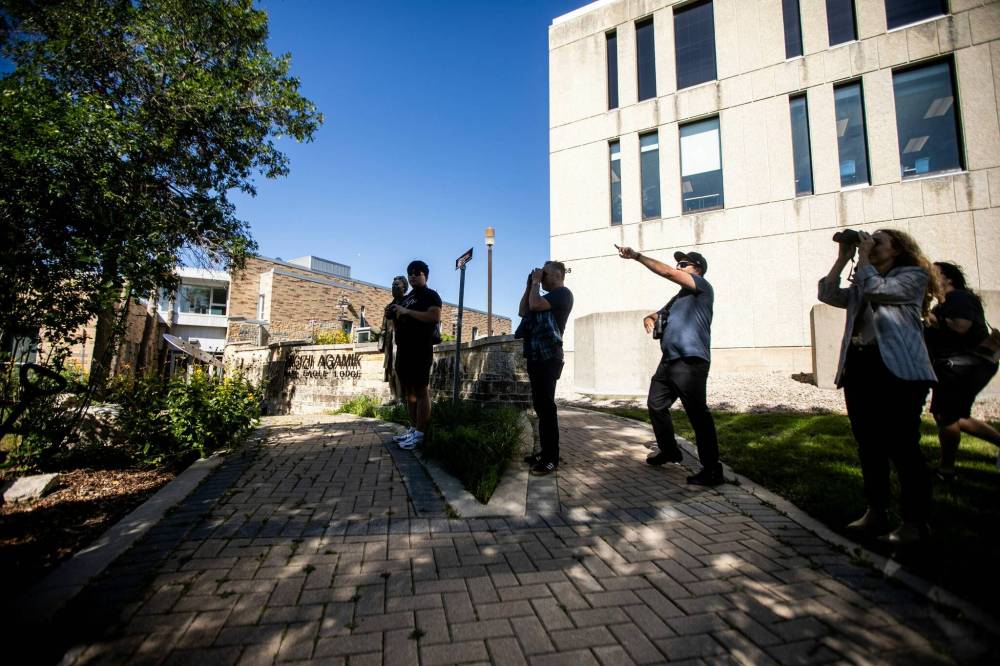 The U of M’s Indigenous Birding Club co-founder Justin Rasmussen (centre) points out bald eagles.