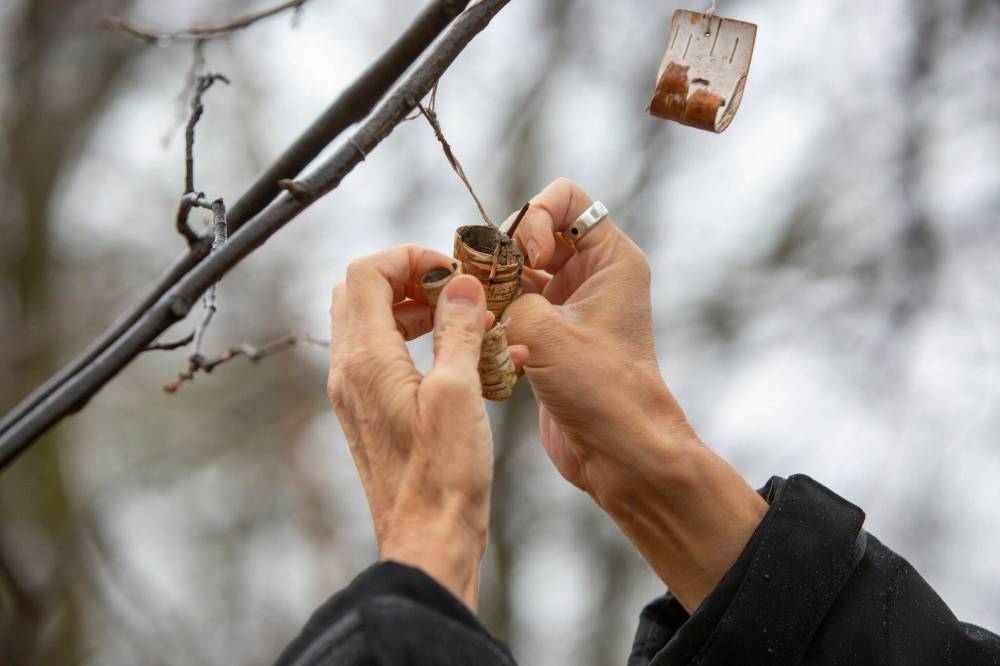 Nayet ties birch bark poems to a linden tree at Île Pollock Park.