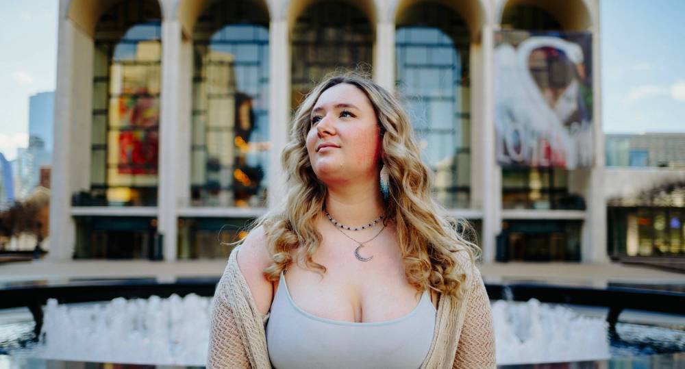 Manitoba soprano Camryn Dewar stands in front of New York’s Lincoln Center, where she is performing in Blind Justice.
