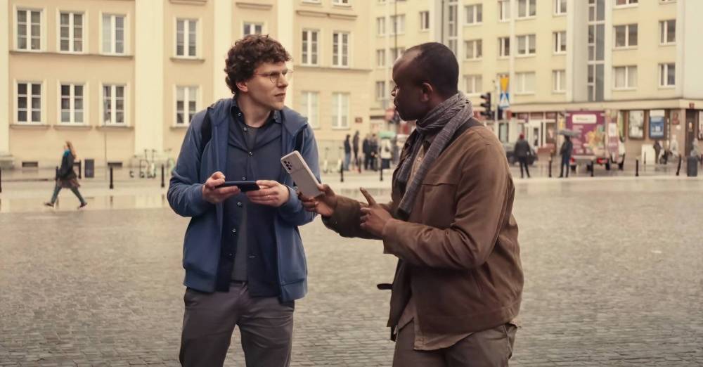 Director/actor Jesse Eisenberg (left) and Kurt Egyiawan in A Real Pain; Egyiawan’s character is based on former Winnipegger Eloge Butera.
