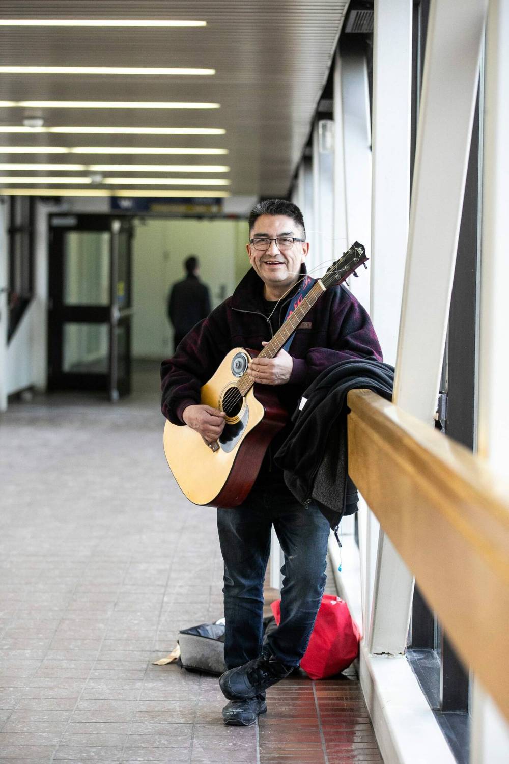 Busker Dwaine Davey regularly performs with his acoustic guitar in the downtown skywalks.