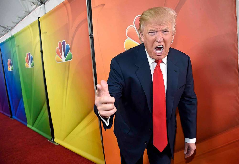 Donald Trump, then host of the television series “The Celebrity Apprentice,” mugs for photographers at an NBC event in 2015. (Chris Pizzello/Invision/AP)